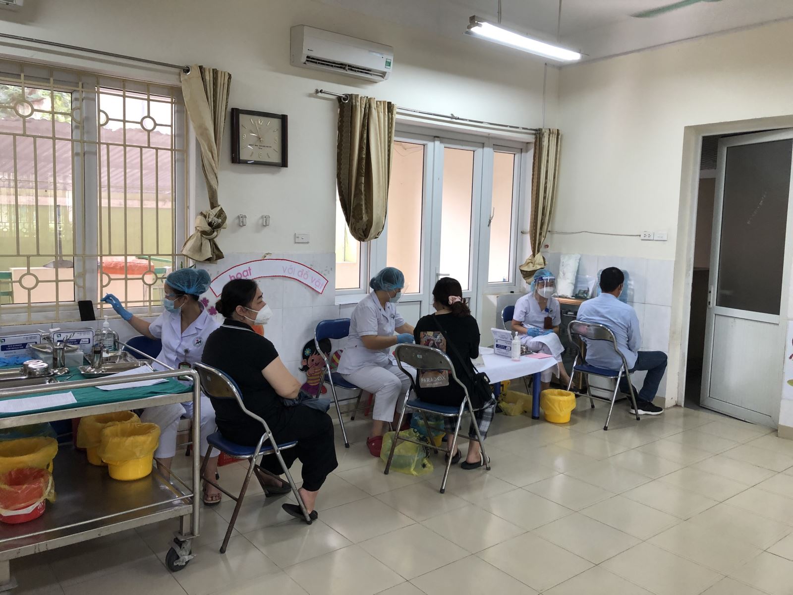 Trong thời gian diễn ra tiêm vắc xin từ ngày 10/9/2021 đến hết ngày 14/9/2021, nhà trường luôn có đội ngũ BGH, giáo viên, nhân viên trực để hỗ trợ khi cần thiết như bổ xung nước uống, cung cấp mạng phục vụ nhập dữ liệu, bổ xung sắp xếp ghế ngồi, quạt, bổ xung phòng nghỉ cho nhân dân sau tiêm…