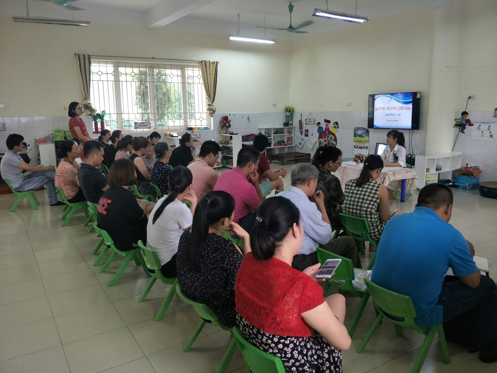Chiều ngày 03/7/2020, nhà trường đã tổ chức học đại diện PHHS 15 lớp học. Đ/c Nguyễn Thị Thu Trang - Bí thư chi bộ, hiệu trưởng nhà trường đã thông qua các nội dung cuộc họp: báo cáo kết quả, thành tích của nhà trường trong năm học 2019-2020, Kế hoạch tổng kết năm học 2019-2020, Hội CMPHHS thông báo kết quả hoạt động trong công tác phối hợp với nhà trường về chăm sóc giáo dục trẻ trong năm học 2019-2020, Kế hoạch hoạt động hè của nhà trường và Kế hoạch tuyển sinh nhà trường trong năm hcoj 2020-2021.