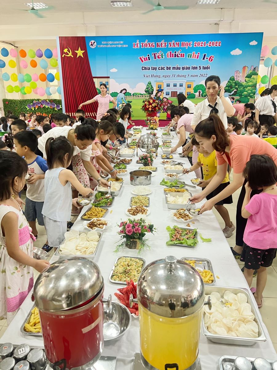 Tiệc buffet cho trẻ mầm non là một trong những hoạt động đầy ý nghĩa, được trẻ vô cùng thích thú và các bậc phụ huynh ủng hộ. Tham gia bữa tiệc buffet không chỉ giúp trẻ được thưởng thức các món ăn ngon miệng, bổ dưỡng, mà còn dạy cho trẻ các kỹ năng tự phục vụ trong cuộc sống hàng ngày, giúp trẻ trau dồi các kỹ năng trong hoạt động tập thể. Chính vì vậy, buổi trưa ngày 30/5/2022, Trường MN Việt Hưng đã tổ chức bữa tiệc buffet cho trẻ của nhà trường nhân dịp Tổng kết năm học 2021 -2022 và Vui tết thiếu nhi 1/6.