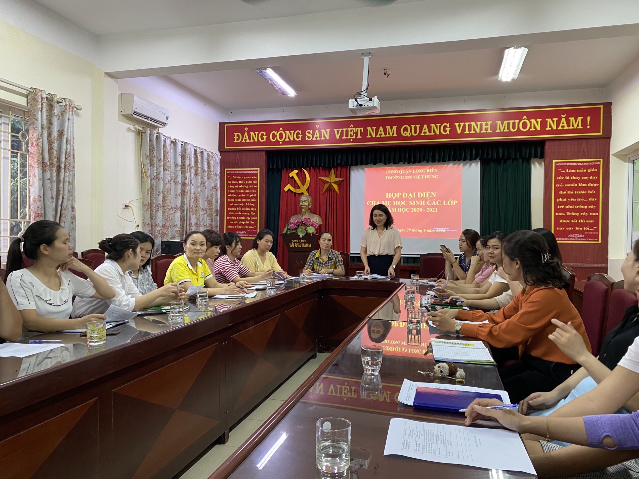 Để thực hiện nhiệm vụ năm học 2020-2021 của Trường MN Việt Hưng đạt hiệu quả cao, cần có sự phối hợp giữa PHHS với nhà trường trong công tác chăm sóc giáo dục trẻ. Chính vì vậy, được sự chỉ đạo của các cấp lãnh đạo, 17h30 phút ngày 29/ 9/2020 trường MN Việt Hưng tổ chức họp đại diện PHHS các lớp trong nhà trường để triển khai các nhiệm vụ trong năm học 2020 - 2021. Đến 17h30 phút ngày 30/9/2020, các lớp học trong nhà trường đã tổ chức họp triển khai các nhiệm vụ trong năm học 2020 - 2021 tới 100% PHHS.
