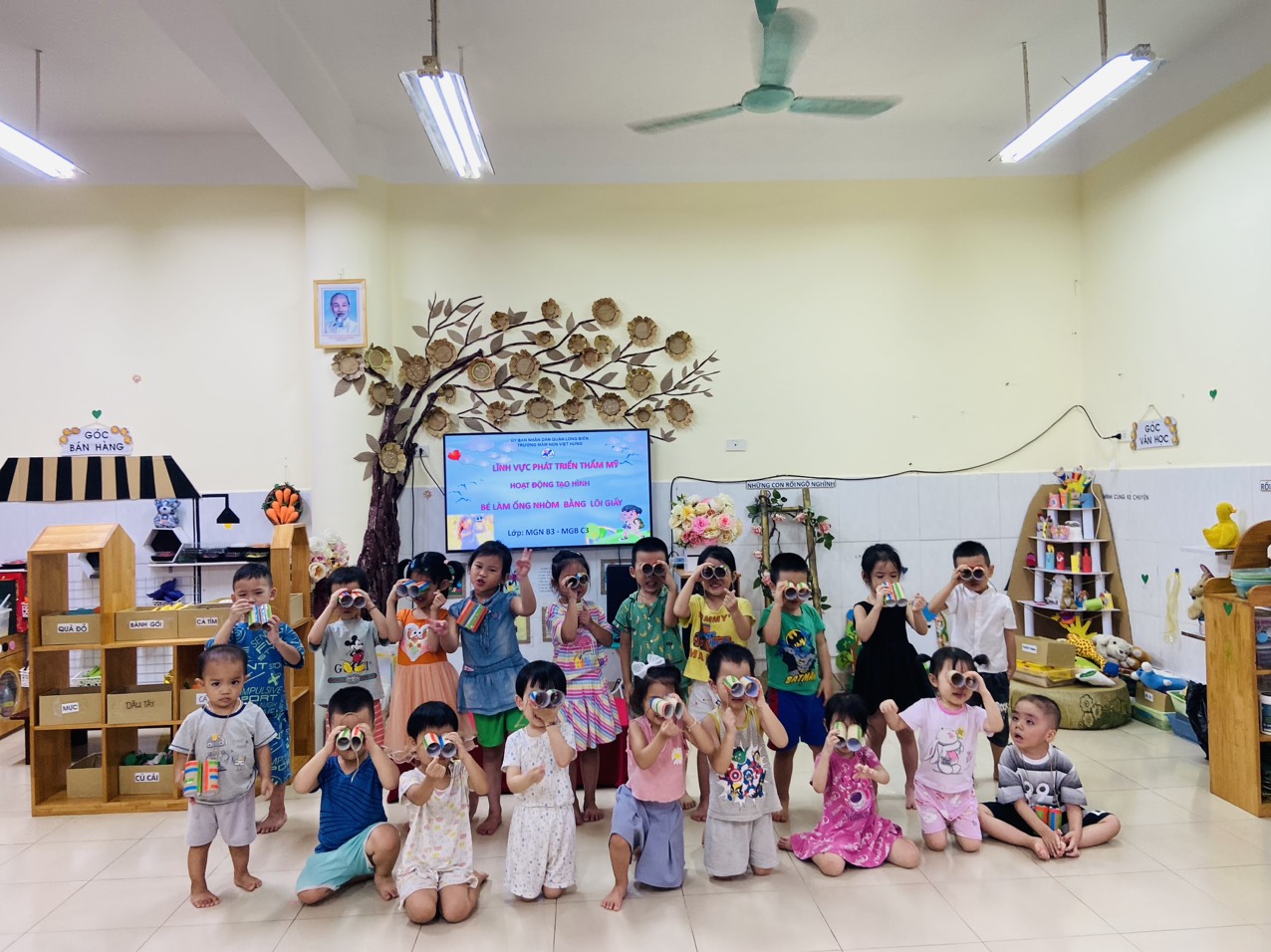 Trong giờ học tạo hình ngày hôm nay, các bạn nhỏ lớp MGBC3 và các bạn lớp MGN B3 được các cô giáo hướng dẫn cách làm ống nhòm từ lõi giấy vệ sinh thật đơn giản mà vô cùng thú vị.