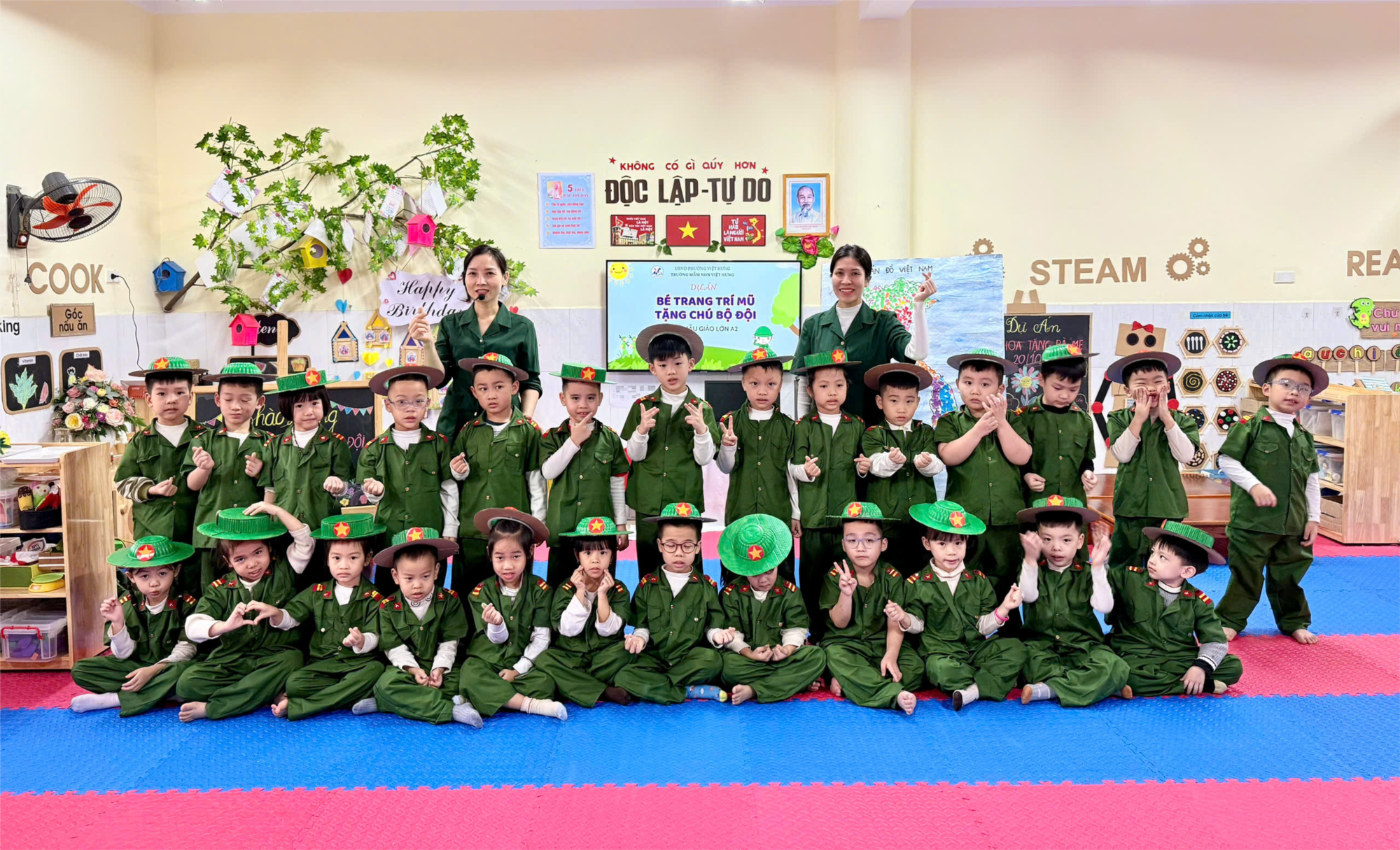Dưới sự hướng dẫn của cô giáo, các bé hào hứng lựa chọn màu sắc, họa tiết và khéo léo trang trí nên những chiếc mũ bộ đội xinh xắn, đáng yêu. Mỗi sản phẩm là tình cảm ngây thơ, trong sáng của các bé lớp A2 gửi tới các chú bộ đội – những người luôn ngày đêm bảo vệ Tổ quốc. Hoạt động không chỉ giúp trẻ rèn luyện sự khéo léo, phát triển óc sáng tạo và thẩm mỹ mà còn góp phần giáo dục lòng yêu nước, biết ơn và kính trọng các chú bộ đội. Buổi hoạt động diễn ra trong không khí vui tươi, sôi nổi và để lại nhiều kỷ niệm đẹp đối với các bé. Dưới đây là một số hình ảnh của hoạt động: