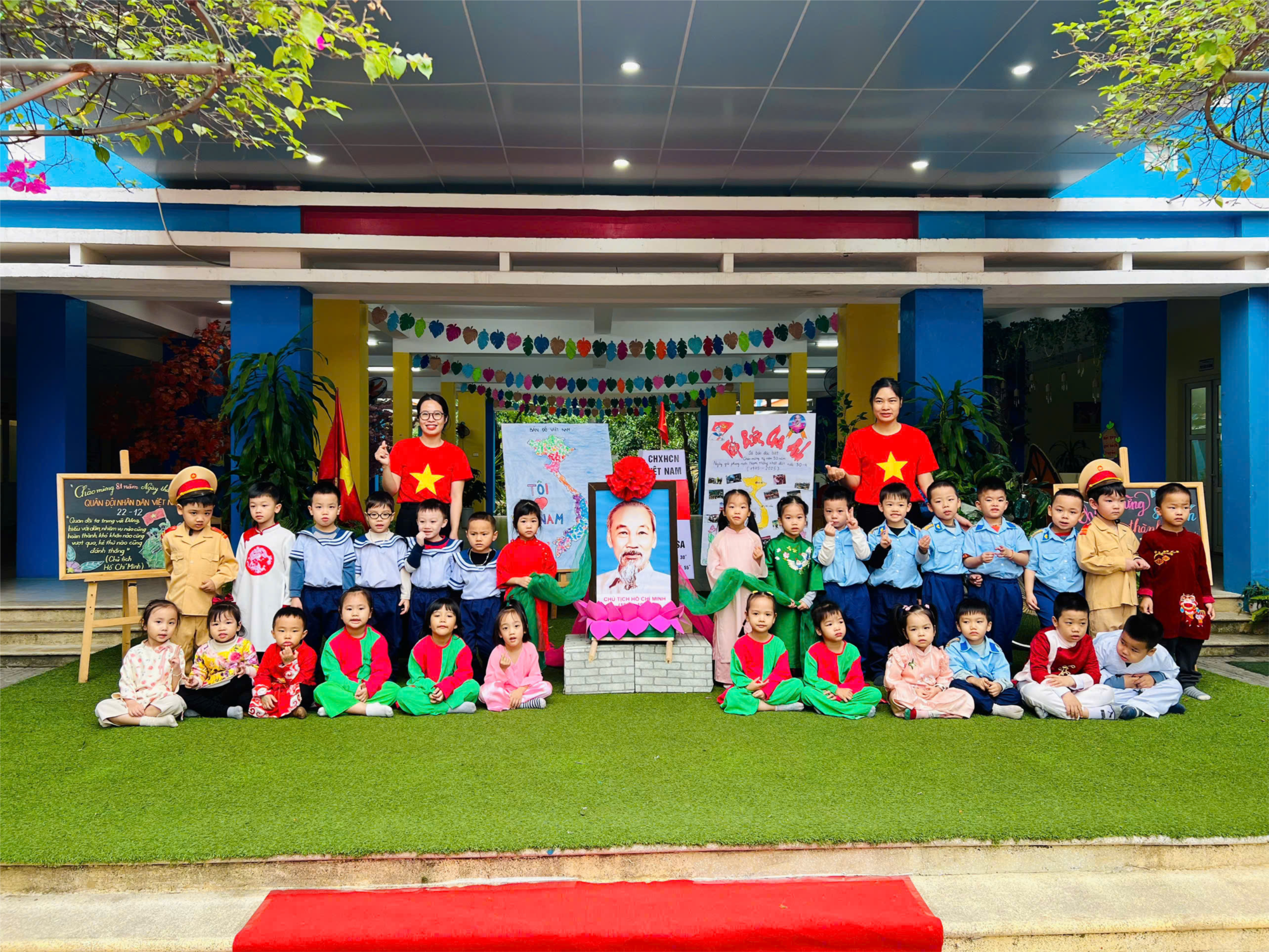 Trong không khí vui tươi, các bé được hóa thân thành những chú bộ đội, quần chúng nhân dân nhỏ nhắn, đáng yêu qua trang phục chỉnh tề, các tiết mục múa hát, các trò chơi vận động sôi nổi. Hoạt động không chỉ mang đến niềm vui, sự tự tin cho trẻ mà còn giúp các bé bước đầu hiểu về hình ảnh chú bộ đội, bồi dưỡng tình yêu quê hương, đất nước và lòng biết ơn đối với các anh hùng đã bảo vệ Tổ quốc. Dưới đây là một số hình ảnh của các bé: