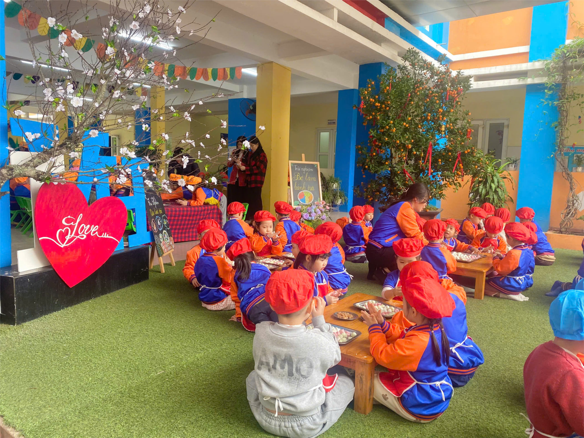 Ngay từ sáng sớm các bạn nhỏ lớp MGN B2 cùng cô giáo đã háo hức chuẩn bị: Bột nếp ngũ sắc, đường, vừng,...Hôm nay, bài học của các con không chỉ đơn giản là những câu chuyện, bài thơ hay các bài tạo hình mà lại thơm nồng mùi của bột nếp, đường - bài học về cách làm bánh trôi trong ngày Tết hàn thực. Mắt nhìn chăm chú, tay nặn bánh rất cẩn thận, xoay vòng, xoay vòng thật kĩ cho bánh thật tròn trịa... rồi ríu rít khoe “Cô ơi con nặn xong rồi này, cô thấy có đẹp không?”. Có những chiếc bánh rất tròn, rất đẹp, có những chiếc bánh nhân lại “chạy” ra ngoài, nhưng cô trò đều cảm thấy vui vẻ, thích thú. Các con rất háo hức với việc tự tay làm những chiếc bánh, sau khi nhờ các bác cấp dưỡng luộc chín bánh, các con đã được thưởng thức những miếng bánh rất ngon, mỗi chiếc bánh mang đến với các con là những thành quả ngọt ngào mà các con xứng đáng được nhận. Dưới đây là một số hình ảnh hoạt động của các con: