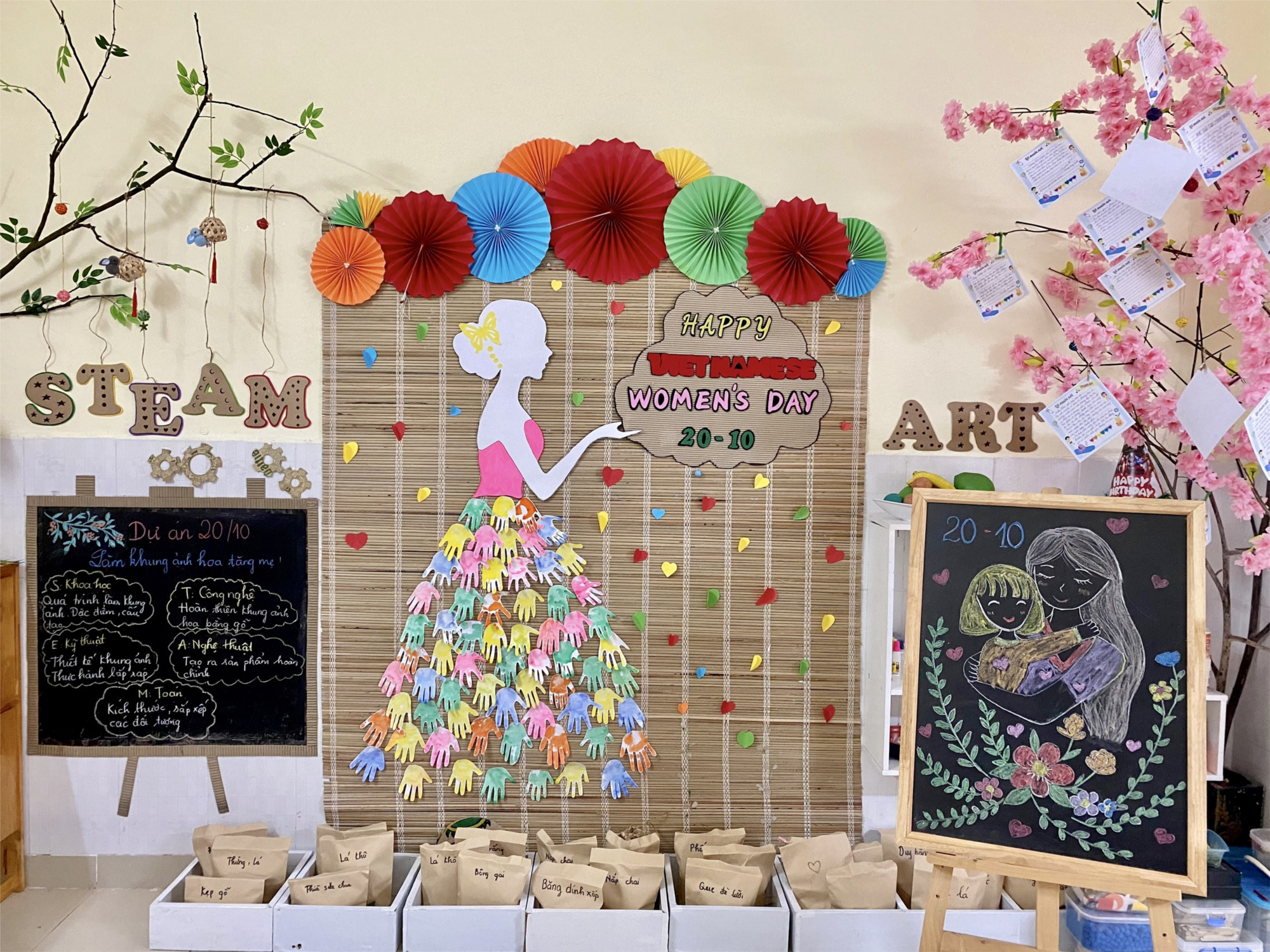 Nhân dịp kỷ niệm ngày Phụ nữ Việt Nam 20/10 và tôn vinh vẻ đẹp của người phụ nữ Việt Nam. Cô và trò lớp MGN B1 đã thoả thuận, thống nhất và xây dựng kế hoạch tạo nên một chuỗi hoạt động vô cùng ý nghĩa để chào mừng. Hôm nay là thứ hai đầu tuần, dưới sự hướng dẫn của cô giáo các con đã sử dụng đôi bàn tay xinh xắn của mình với muôn vàn màu sắc để tạo nên chiếc váy xinh tặng mẹ.