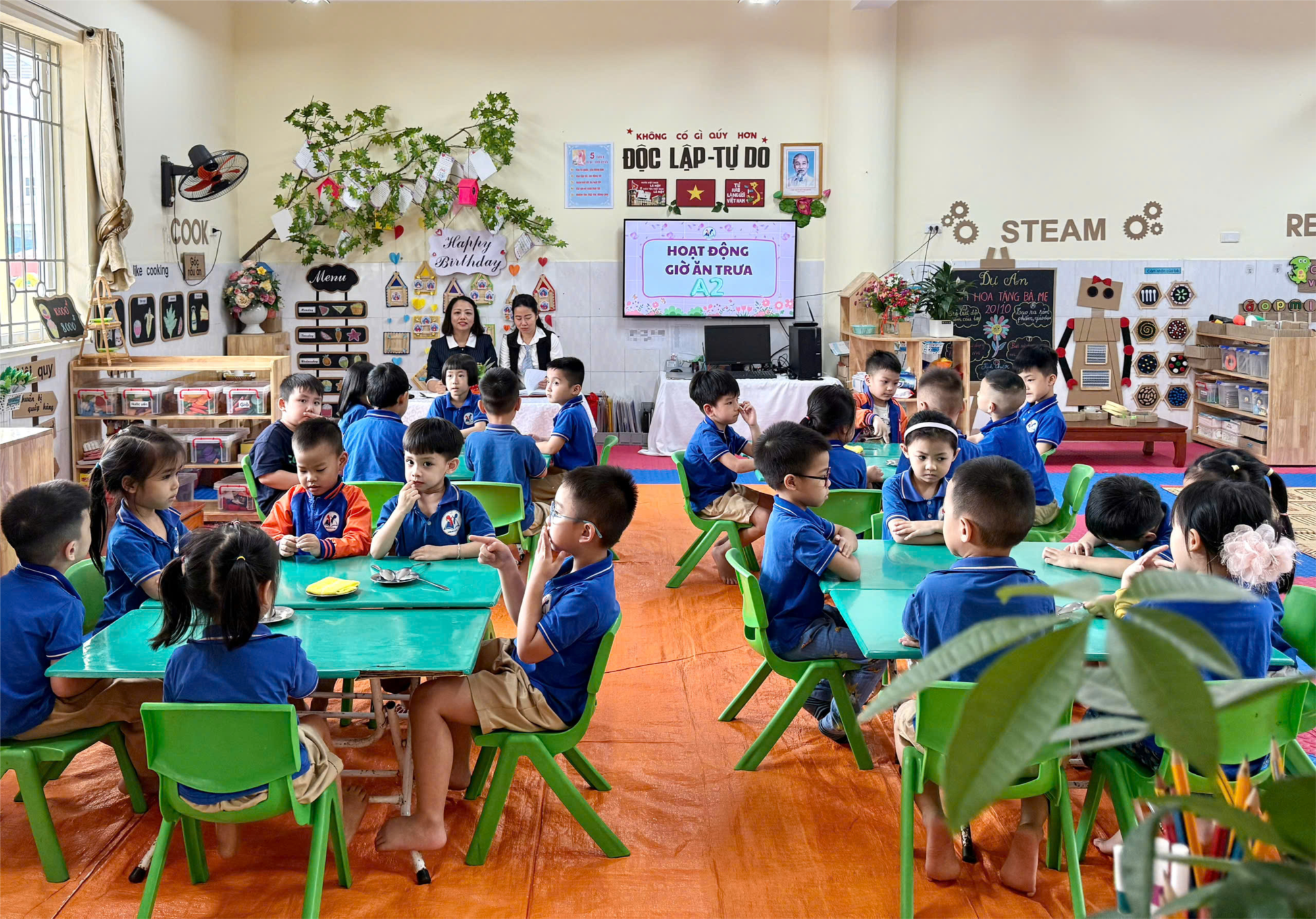 Trong trường mầm non, giờ ăn và ngủ là hoạt động không thể thiếu trong một ngày của trẻ. Các cô giáo luôn chuẩn bị chu đáo, đảm bảo bữa ăn của trẻ đầy đủ dinh dưỡng, an toàn và hợp khẩu vị. Trẻ biết rửa tay sạch sẽ, lau mặt, ngồi ngay ngắn, tự xúc cơm, ăn gọn gàng và vui vẻ cùng bạn bè. Cô nhẹ nhàng khuyến khích, động viên để các con ăn hết suất, tạo không khí thoải mái, thân thiện trong bữa ăn. Sau khi ăn, các bé được cô hướng dẫn vệ sinh cá nhân, uống nước, súc miệng nước muối, lau miệng và chuẩn bị chỗ ngủ gọn gàng. Giờ ngủ diễn ra trong không gian yên tĩnh, thoáng mát, cô nhẹ nhàng ru trẻ vào giấc ngủ và thường xuyên quan sát, chăm sóc từng bé để đảm bảo an toàn tuyệt đối.