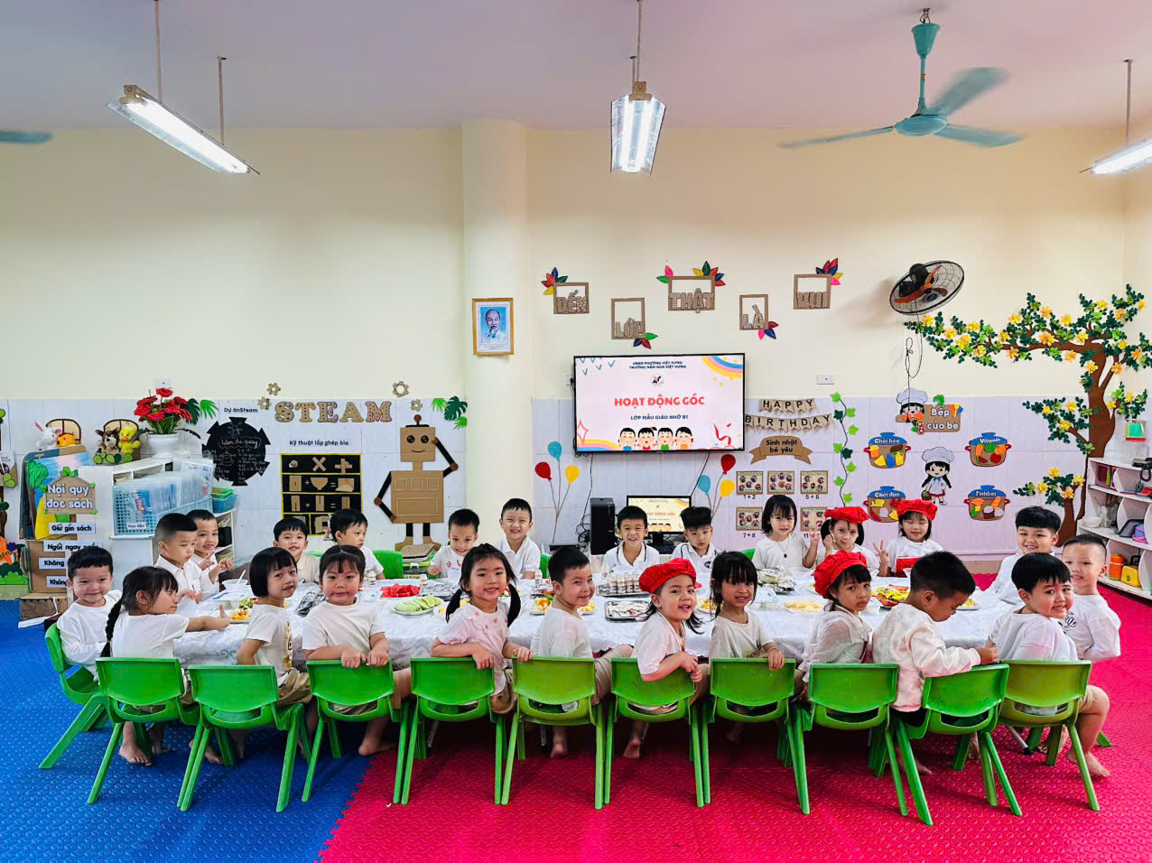 Ở góc xây dựng, các con cùng nhau khéo léo xếp nhà cao tầng; góc nghệ thuật rộn ràng với những bức tranh đầy sắc màu; góc phân vai lại thật sôi nổi với trò chơi “bán hàng” đáng yêu. Đặc biệt ở góc nấu ăn, các con còn được tự tay làm món salad rau quả tươi ngon. Những bàn tay nhỏ nhắn thoăn thoắt cắt trái cây, trộn rau và trang trí đĩa salad thật đẹp mắt. Mỗi hoạt động đều giúp các con rèn luyện kỹ năng giao tiếp, hợp tác và phát triển trí tưởng tượng phong phú. Giờ hoạt động góc luôn là khoảng thời gian mà các con mong chờ nhất trong ngày.