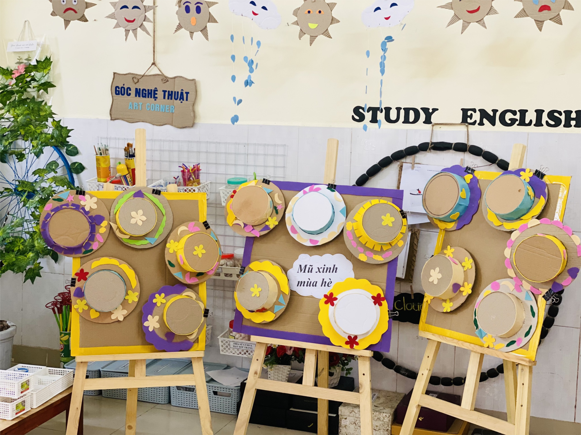 Mùa hè đến, thời tiết thật là nắng nóng phải không các con. Hôm nay cô trò chúng ta sẽ cùng trang trí để tạo nên những chiếc mũ mùa hè thật đẹp nhé. Các con hãy lấy những họa tiết xinh xắn như: Hình trái tim, hình ngôi sao, hình mặt trăng, những bông hoa với nhiều màu sắc... để cùng sáng tạo và trang trí cho chiếc mũ của mình.