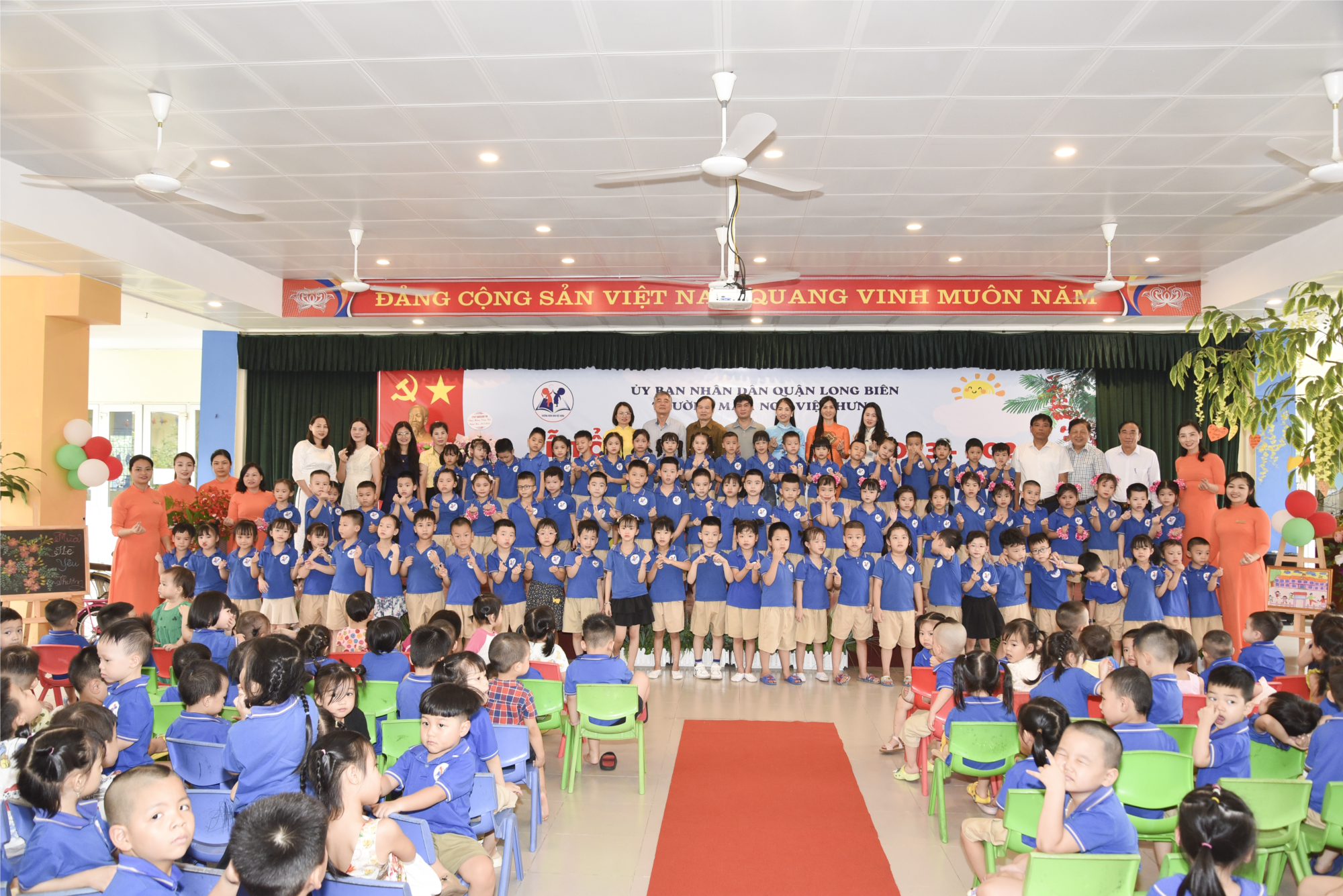 Để đánh dấu một bước ngoặt lớn của các bé 5 tuổi, mới ngày nào đây các bé còn nhỏ xíu, ngây thơ, rất bở ngỡ khi ba mẹ đưa đến trường cũng nhờ sự chăm sóc yêu thương dạy dỗ tận tình của các cô giáo đã đặt cho các bé một nền móng vững chắc một hành trang bước vào lớp 1 và chủ nhân tương lai cho đất nước. Đây là dịp để các cháu nói lên cảm nghĩ của mình và bày tỏ tấm lòng tri ân của mình đến cha mẹ, thầy cô khi chia tay trường Mầm non Việt Hưng thân yêu. Ban giám hiệu nhà trường đã trao giấy chứng nhận hoàn thành chương trình giáo dục mẫu giáo cho các bé của khối lớp 5 tuổi cùng với lời chúc “Chúc các con ngày càng học giỏi, chăm ngoan. Đây sẽ là khoảnh khắc đáng nhớ, là kỷ niệm đẹp để các cháu khép lại cấp học mầm non và vững vàng cho khởi đầu một cấp học mới!”