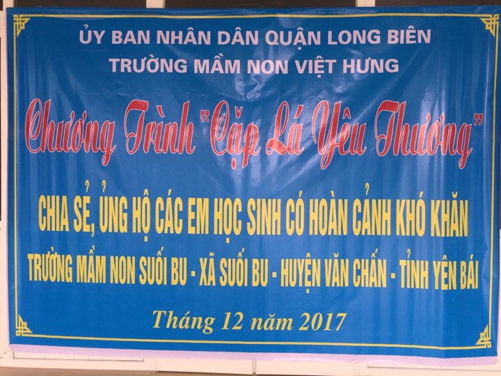 Trường Mầm non Việt Hưng tổ chức chương trình “Cặp lá yêu thương” phát quà cho các em nhỏ có hoàn cảnh đặc biệt khó khăn tại Trường Mầm non Suối Bu - Xã Suối Bu - Huyện Văn Chấn - Tỉnh Yên Bái.