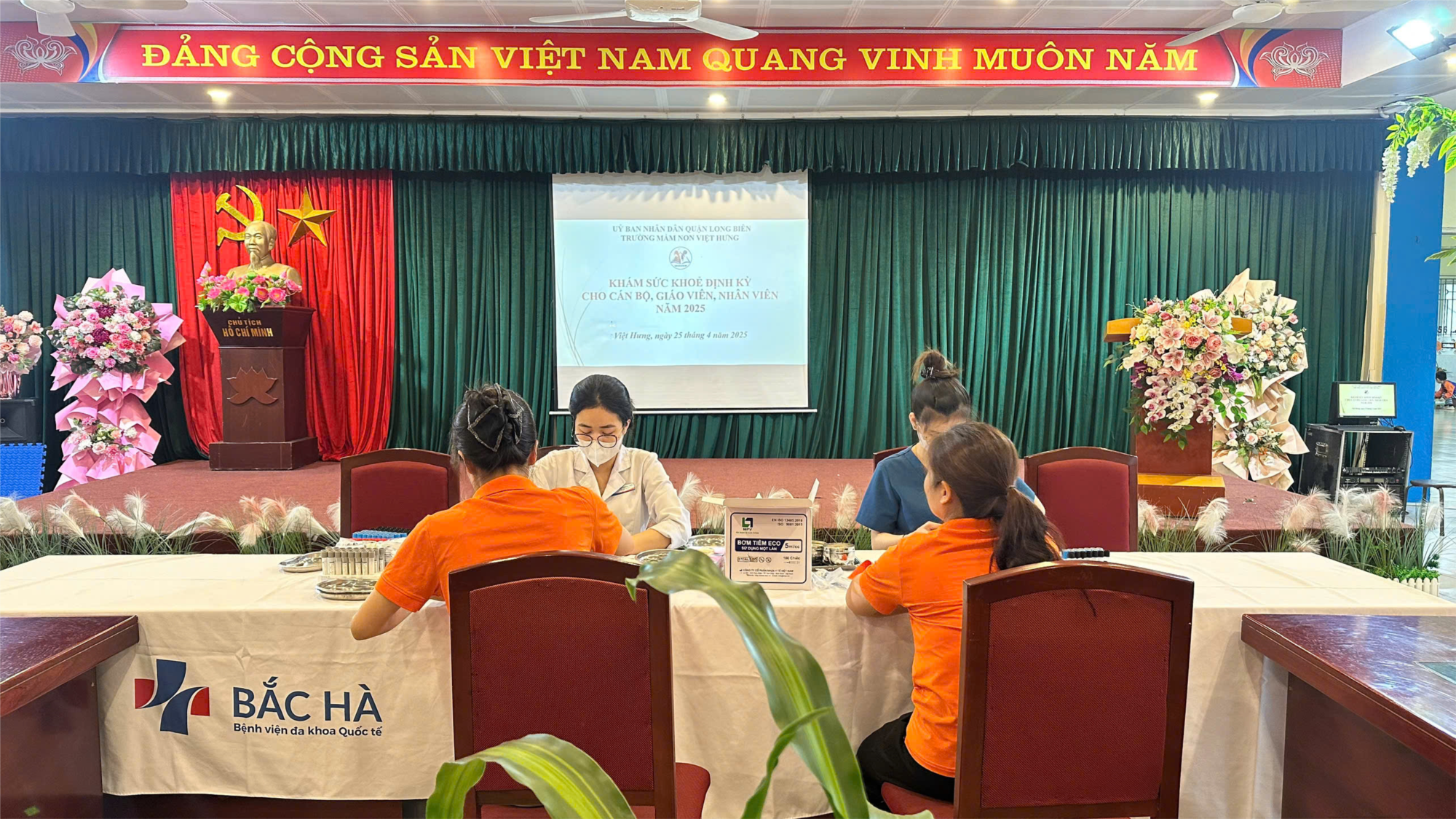 Ngày 24,25/4/2025, trường Mầm non Việt Hưng phối hợp với Bệnh viện đa khoa quốc tế Bắc Hà đã tổ chức khám sức khỏe cho cán bộ, giáo viên, nhân viên nhà trường năm 2025. Qua thăm khám nhằm giúp giáo viên phát hiện bệnh lý và có phác đồ điều trị kịp thời để có một sức khỏe tốt nhất để công tác và cống hiến cho sự nghiệp giáo dục.