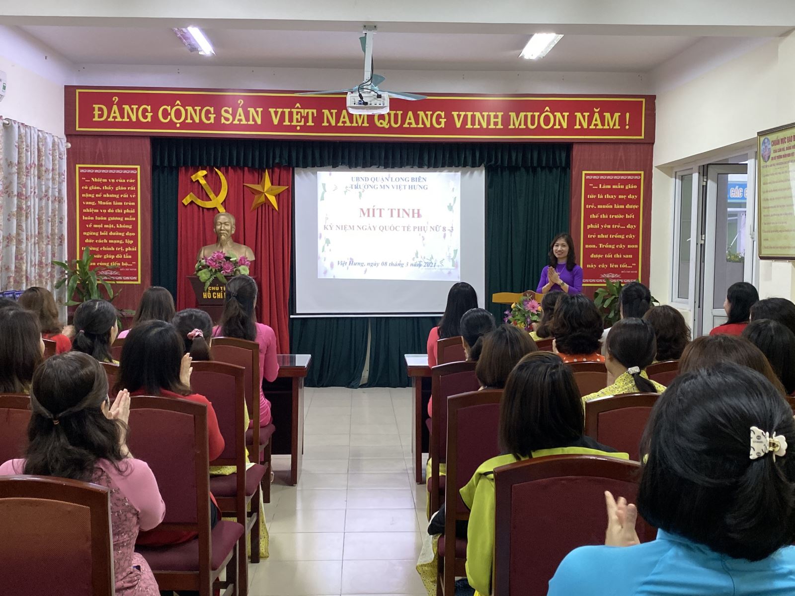 Hoà chung trong không khí vui tươi, phấn khởi của phụ nữ cả nước chào mừng kỷ niệm 111 năm Ngày Quốc tế Phụ nữ 8/3, 1981 năm Khởi nghĩa Hai Bà Trưng. Sáng ngày 8/3, Công đoàn Trường MN Việt Hưng long trọng tổ chức Mít tinh Kỷ niệm ngày Quốc tế phụ nữ 8/3. Tham gia buổi Mít tinh có các đ/c Đặng Thị Thanh Xuân - Bí thư chi bộ, HT nhà trường, Đ/c Nguyễn Thị Hiếu- Chủ tịch Công đoàn nhà trường; cùng các đc trong BGH, GV, Nv nhà trường.