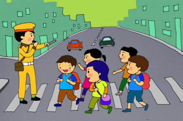 – Khi đi bộ qua cổng trường cần quan sát đường trước khi sang phần đường của mình