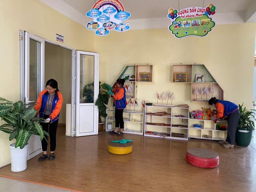 Nhà trường thường xuyên vệ sinh, khử khuẩn lớp học, đồ dùng cá nhân và đồ chơi của trẻ. Đảm bảo không gian lớp học luôn sạch sẽ, thông thoáng.