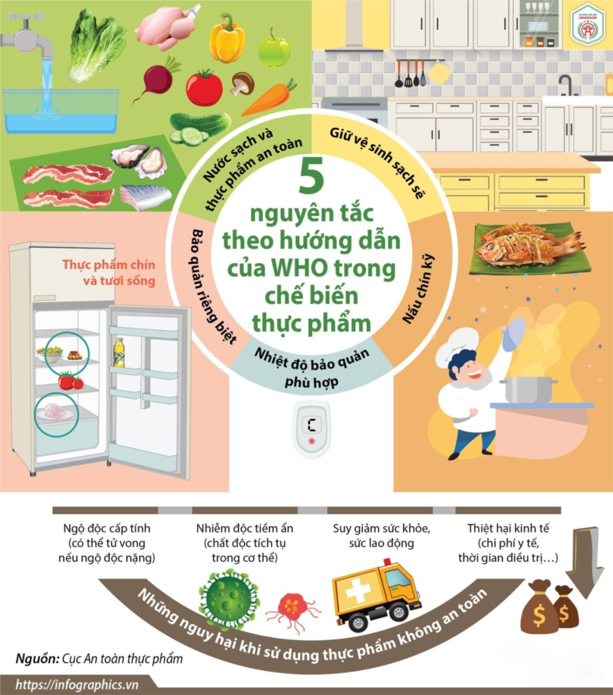 – Nên chọn thực phẩm tươi, sạch, thực hiện ăn chín, uống chín, không để thức ăn sống lẫn với thức ăn chín, thức ăn đã nấu chín nên ăn ngay (trong 2 giờ đầu), phải được bảo quản đúng cách, đun kỹ trước khi sử dụng lại, không sử dụng thức ăn quá hạn, bị ôi thiu;