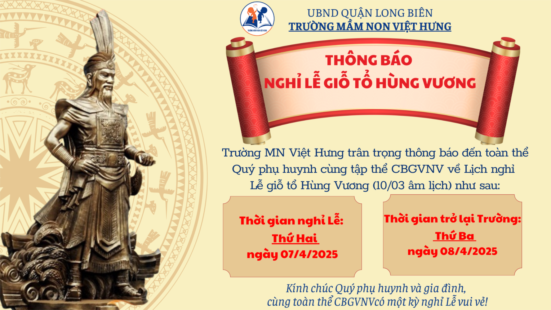 Nhà trường xin trân trọng thông báo đến toàn thể Quý phụ huynh cùng tập thể cán bộ, giáo viên, nhân viên về lịch nghỉ Lễ giỗ tổ Hùng Vương (10/03 âm lịch) cụ thể như sau: