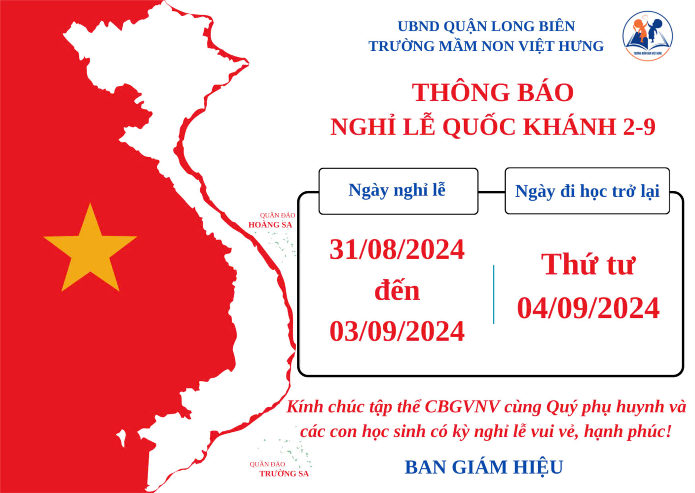 Trường Mầm non Việt Hưng thông báo tới Quý phụ huynh thời gian nghỉ Lễ 2/9 như sau: