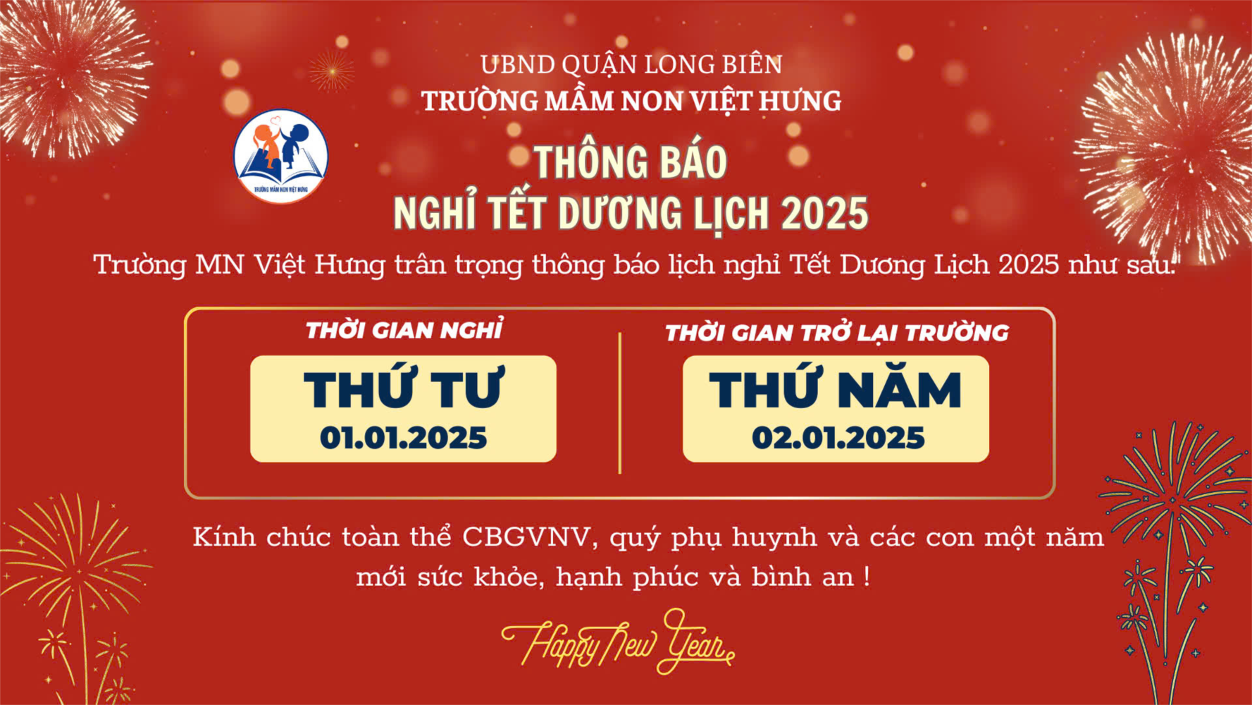 Trường Mầm non Việt Hưng trân trọng gửi đến Quý Phụ huynh cùng các con Học sinh lịch nghỉ Tết Dương Lịch 2025 như sau: