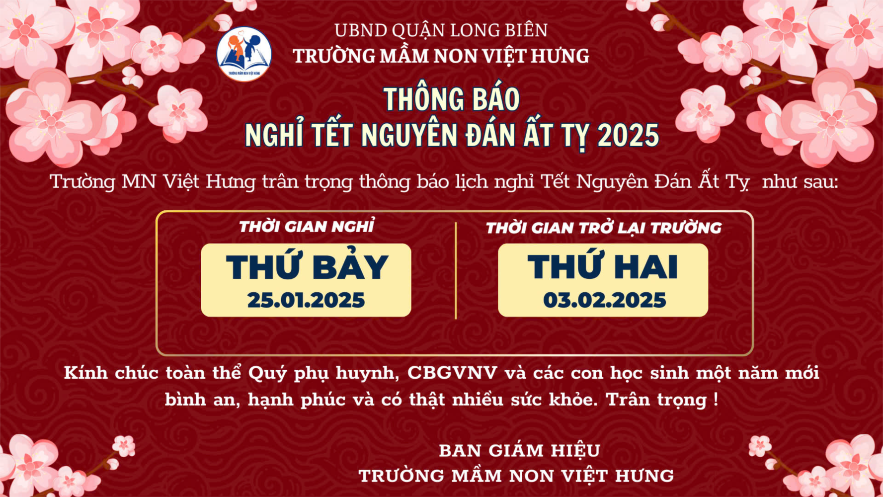 Trường Mầm non Việt Hưng trân trọng gửi đến Quý Phụ huynh cùng các con Học sinh lịch nghỉ Tết Nguyên đán Ất Tỵ 20252025 như sau: