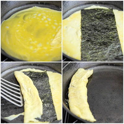 - Đổ một lớp mỏng hỗn hợp trứng vào chảo, hơi nghiêng chảo để trứng được dàn đều kín mặt chảo. Rán trứng đến khi thấy phần dìa bên cạnh của trứng và phần mặt trên của trứng bắt đầu chuyển màu vàng, chín được khoảng 80-85% thì đặt một tấm rong biển lên trên. Sau đó dùng đũa hoặc thìa cán dài để cuộn trứng. Lưu ý không để trứng chín quá sẽ khó cuộn. Sau khi cuộn xong đẩy trứng về phía mép bên trái của chảo.