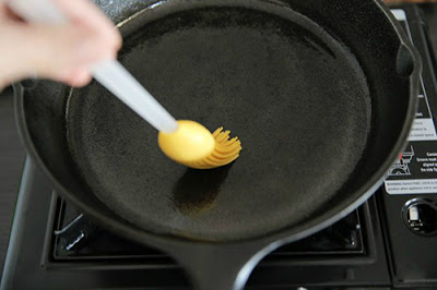 - Làm nóng chảo chống dính, để lửa nhỏ. Cho một chút dầu ăn vào, láng dầu đều trong chảo.
