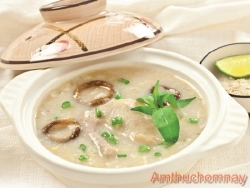 Nguyên liệu: 50gr gạo; 4 chén nước; 30 gr thịt gà nạc; 30gr nấm rơm; 1 muỗng nhỏ dầu ăn; hành; gia vị...