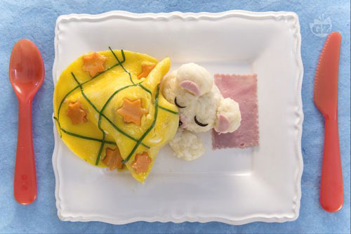 Bước 3: Cà rốt sau khi gọt vỏ rửa sạch, các bạn thái mỏng, sau đó có thể dùng dao hoặc dùng khuôn để tạo hình. Rồi đem luộc qua cho mềm rồi đặt lên trứng đang rán. Giờ đây chúng ta có 1 chiếc chăn tuyệt đẹp cho gấu rồi ! Bây giờ các bạn trộn cơm với pho mai bào nhỏ rồi cho 1 thìa vào giấy bóng kính