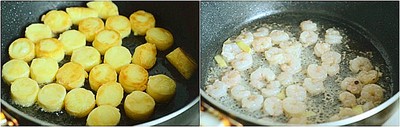Tận dụng phần dầu vừa rán đậu, làm nóng chảo trở lại, cho gừng thái sợi vào đảo thơm. Sau đó mới trút tôm vào đảo nhanh tay.