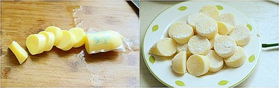 Đậu hũ non cắt thành từng khoanh tròn dày chừng 1cm, cho đậu ra đĩa sâu lòng hoặc âu lớn. Rắc bột bắp lên khắp mặt đậu, xóc nhẹ cho bột bám đều xung quanh miếng đậu.