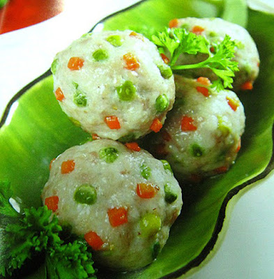 - Cho cá thác lác xay, cà rốt, đậu Hà Lan, đầu hành, hạt nêm, đường vào thố, trộn đều, vo viên nhỏ, mang hấp chín.