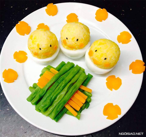 - Dùng vừng tạo mắt gà, mỏ dùng cà rốt.