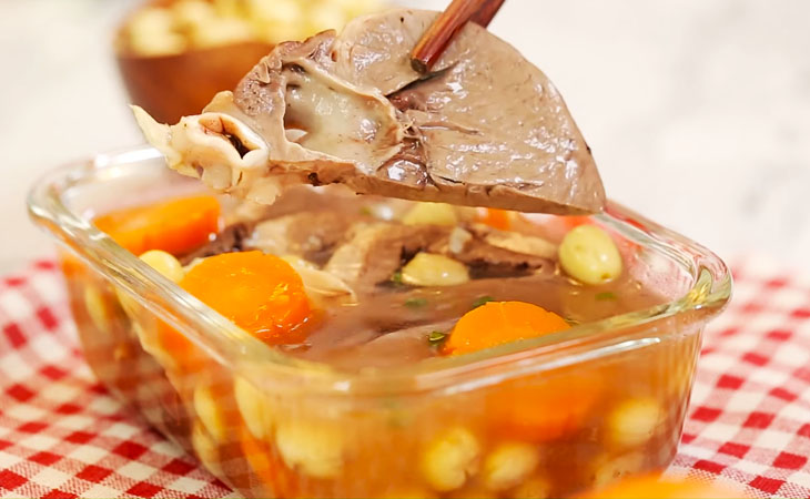 - Tiếp theo bỏ tim lợn và cà rốt vào ninh khoảng 35-40 phút cho đến khi tim chín nhừ.