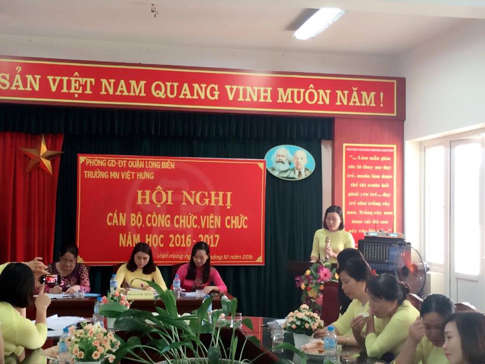 Ngày 20/10/2016, trường Mầm Non Việt Hưng đã tổ chức Hội nghị cán bộ, công chức, viên chức năm học 2016 - 2017. Hội nghị đã có sự tham mặt đông đủ của cán bộ công chức, viên chức nhà trường. Tại hội nghị đồng chí Hiệu trưởng nhà trường đã đọc Báo cáo kết quả thực hiện nhiệm vụ năm học 2015 - 2016 và dự thảo kế hoạch thực hiện nhiệm vụ năm học 2016 – 2017. Báo cáo tình hình thực hiện ngân sách, việc thu - chi, quản lý tài chính trong năm vừa qua và kế hoạch thu, chi tài chính năm mới của nhà trường. Thông qua một số nội dung Nội quy, Quy chế dân chủ, Quy chế chi tiêu nội bộ, Quy chế Thi đua- Khen thưởng của nhà trường và công đoàn.