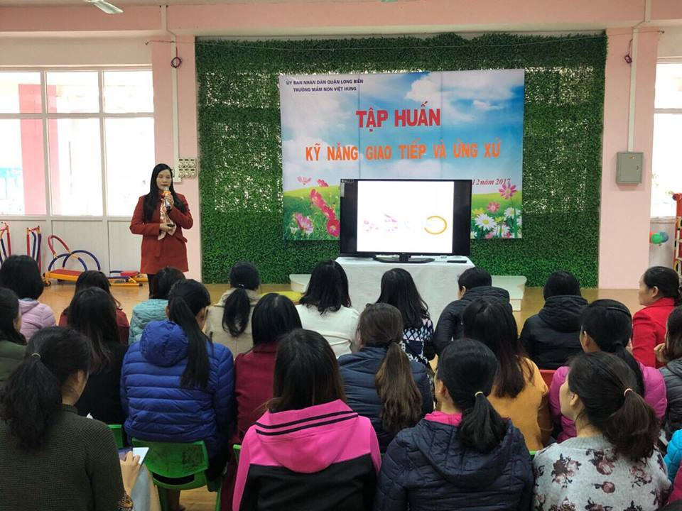 Giao tiếp và ứng xử là kỹ năng cần thiết cho mỗi người trong cuộc sống hàng ngày, đặc biệt là với môi trường giáo dục mầm non . Các cô giáo luôn phải giao tiếp và ứng xử với học sinh,phụ huynh và đồng nghiệp một cách đúng mực và thân thiện nhất. Với kỹ năng vốn có và những điều đã học được trong quá trình đã học tập và làm việc của mỗi CBGVNV nhà trường, mỗi người đã trang bị cho mình những kỹ năng giao tiếp và ứng xử cần thiết. Nhưng trong xã hội ngày càng phát triển hiện nay thì giao tiếp và ứng xử lại càng được chú trọng hơn. Nhận thức được tầm quan trọng đó, trường mầm non Việt Hưng đã mời giảng viên Văn Thị Hoài- GV Học viện hành chính quốc gia về tại nhà trường để trò chuyện và truyền đạt những kiến thức và kỹ năng về giao tiếp và ứng xử trong môi trường giáo dục đặc biệt là môi trường giáo dục mầm non
