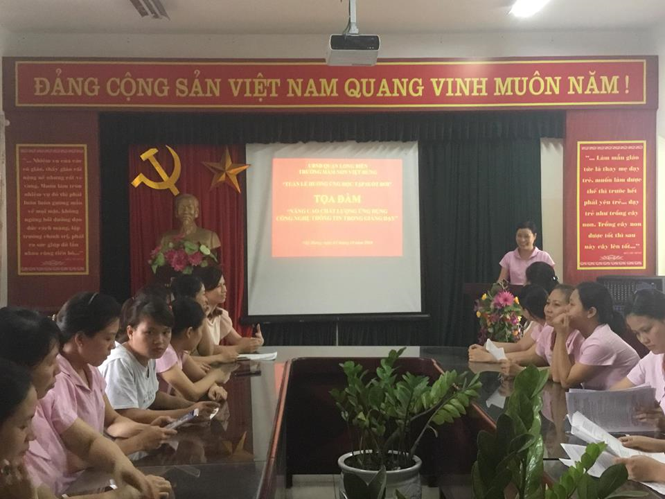 Với sự phát triển của khoa học - kỹ thuật, nhiều phương tiện hỗ trợ dạy học ra đời, đã mang lại hiệu quả, giúp giáo viên có thể định hướng học sinh tiếp cận với nguồn tri thức phong phú, dễ hiểu nhất. Từ việc lên lớp bằng giáo án điện tử, dạy học bằng trình chiếu trên màn hình (Powerpoint), những năm gần đây còn xuất hiện thêm những thiết bị công nghệ dạy học hiện đại như: Bảng điện tử thông minh, sách giáo khoa điện tử, phần mềm thiết kế bài giảng E-learning... Trường MN Việt Hưng tổ chức buổi tọa đàm trao đổi kinh nghiệm về Nâng cao chất lượng ứng dụng công nghệ thông tin trong giảng dạy